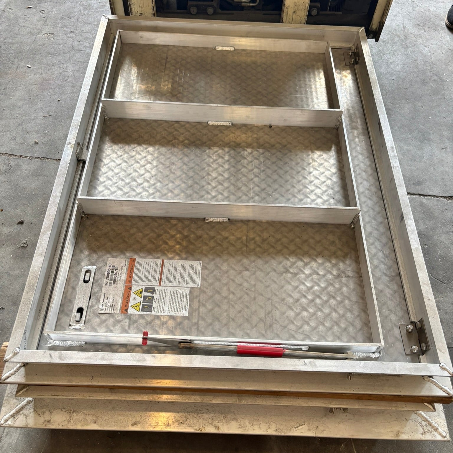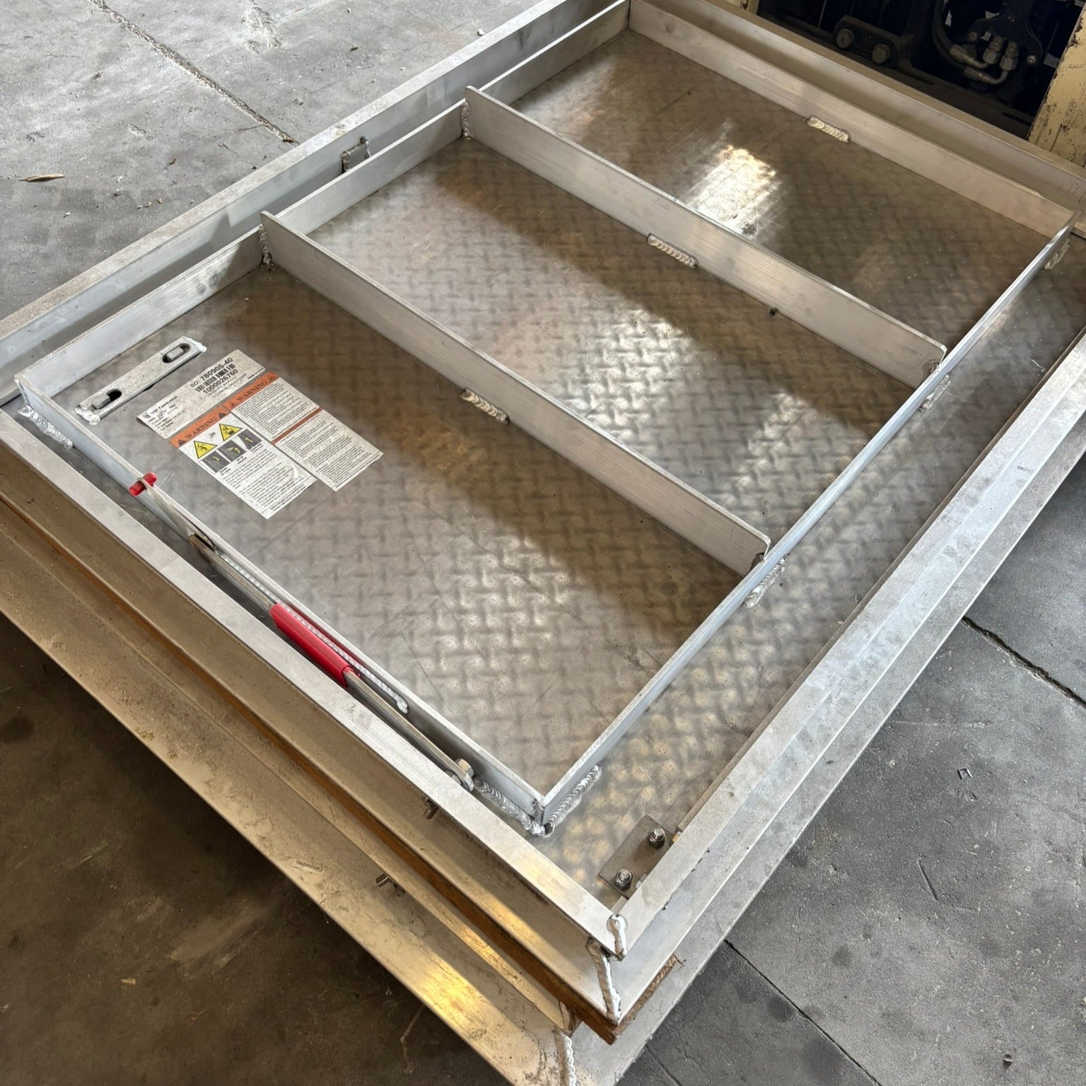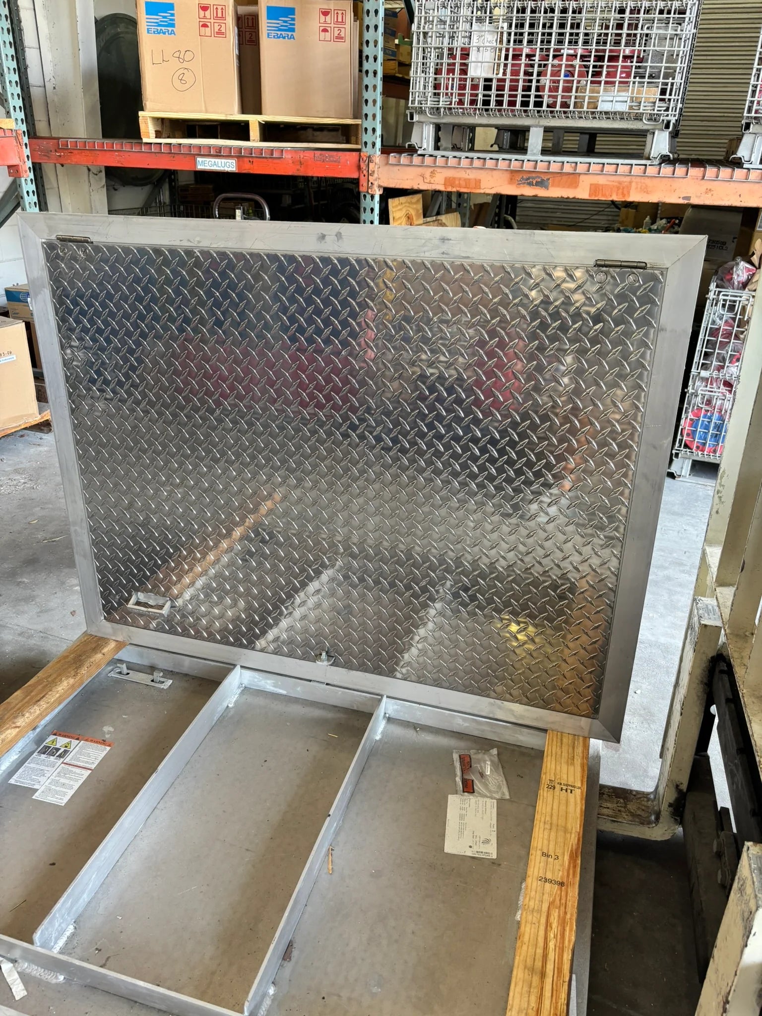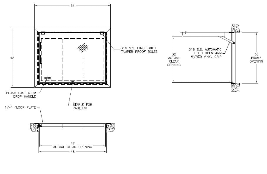 Integral Door:1/4-inch (6.4mm) aluminum diamond plate cover reinforced for 300 psf (1462 kg/m2) live load. Equipped with cast aluminum flush lifting handle and 316 stainless steel hold-open arm with red vinyl grip that automatically keeps the cover in its open/upright position.